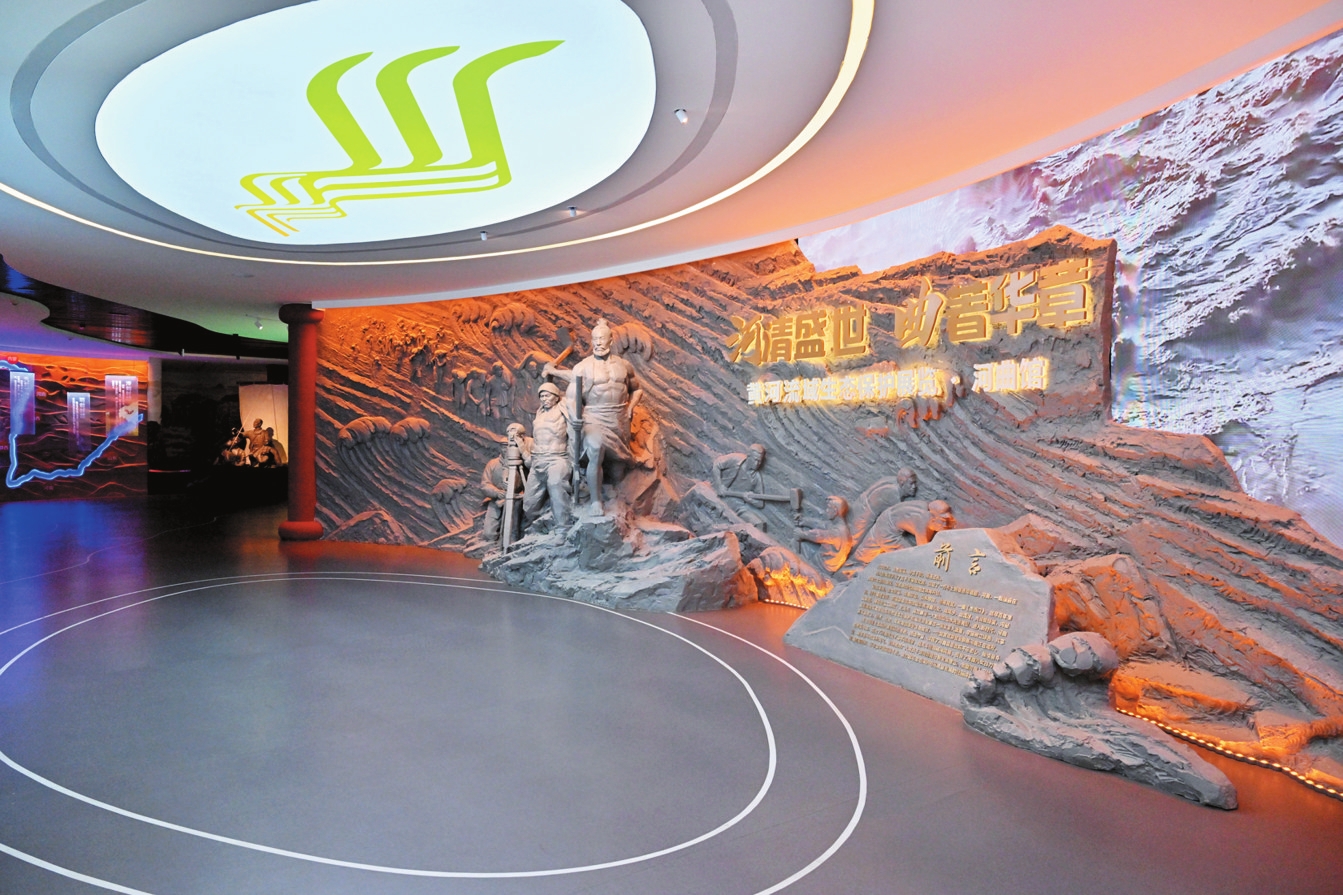 在第五篇章“大河之夢·生態(tài)和諧”展區(qū)的弧幕影院里,《河清盛世曲著華章》主題影片展現著新時代圖景:國家園林縣城的林蔭道上,光伏板與古長城交相輝映;黃河濕地公園里,黑鸛與白天鵝掠過水面;整溝治理后的山坡上,民宿集群飄起裊裊炊煙。